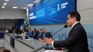 Governador Eduardo Riedel durante apresentação técnica da Rota da Celulose, que prevê R$ 10,1 bilhões em investimentos em 870 km de rodovias em Mato Grosso do Sul.