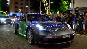 Um Porsche 718 Cayman GTS iluminado percorreu o desfile natalino da cidade na noite de terça-feira
