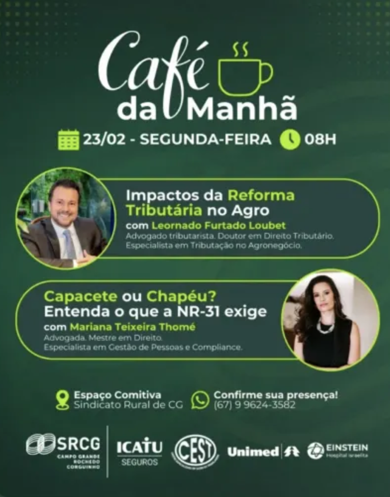 Na última segunda-feira do mês, dia 23 de fevereiro, o Sindicato Rural de Campo Grande, Rochedo e Corguinho abre novamente as portas para um encontro que já virou tradição entre produtores rurais, empresários e profissionais do agronegócio. A partir das 8h da manhã, o Café da Manhã reúne informação, conversa direta e temas que impactam o dia a dia de quem vive do campo.