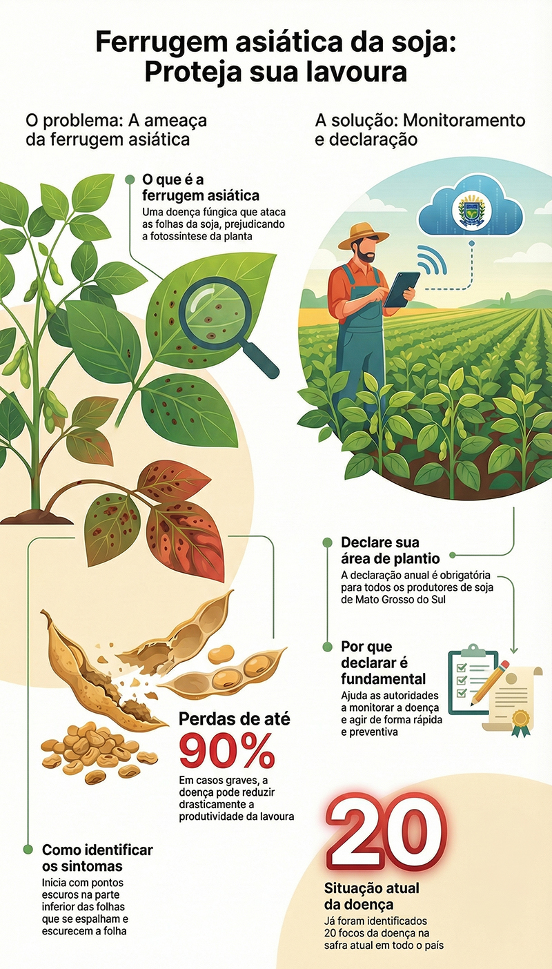 Por que declarar? - A declaração das áreas plantadas permite às autoridades acompanhar com precisão a localização e o estágio da cultura, o que é fundamental para ações preventivas e reativas de controle da ferrugem asiática. Quem deixa de fazer o cadastro pode sofrer sanções previstas na legislação, reforçando que a adesão é uma obrigação para todo produtor rural que cultiva soja no estado. A declaração deve ser feita neste link.