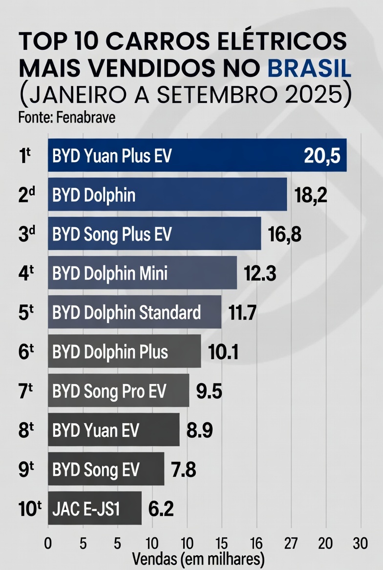 Entre janeiro e setembro de 2025, o Brasil emplacou 53.379 veículos elétricos. Desses, 40.183 vieram de uma única fabricante. A BYD, marca chinesa que ninguém conhecia até outro dia, lidera com folga a lista dos modelos mais vendidos no país. O Dolphin Mini GS5, da mesma marca, sozinho, somou 20.869 unidades no período, segundo dados da Associação Brasileira do Veículo Elétrico.