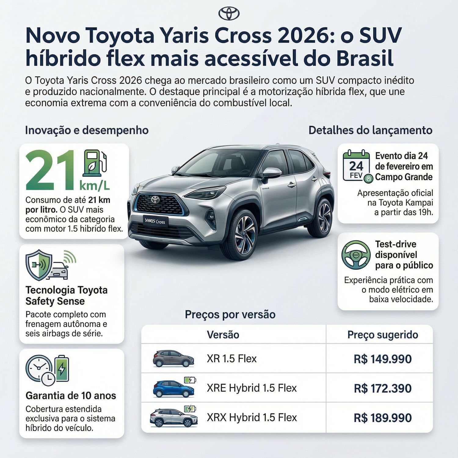 Na próxima terça-feira (24 de fevereiro), Campo Grande vai conhecer de perto um dos lançamentos mais aguardados do ano. A partir das 19h, a concessionária Toyota Kampai abre as portas para a estreia oficial do Toyota Yaris Cross 2026, um SUV que chega cercado de expectativa e com a missão de mexer com o mercado.