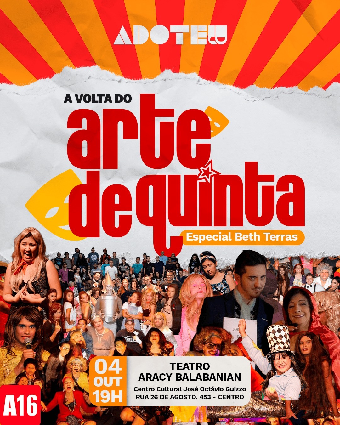Campo Grande recebe nesta sexta-feira (4) uma edição especial do espetáculo Arte de Quinta, no Teatro Aracy Balabanian. A peça homenageia Beth Terras, fundadora da companhia ADOTE, que morreu em 2024.