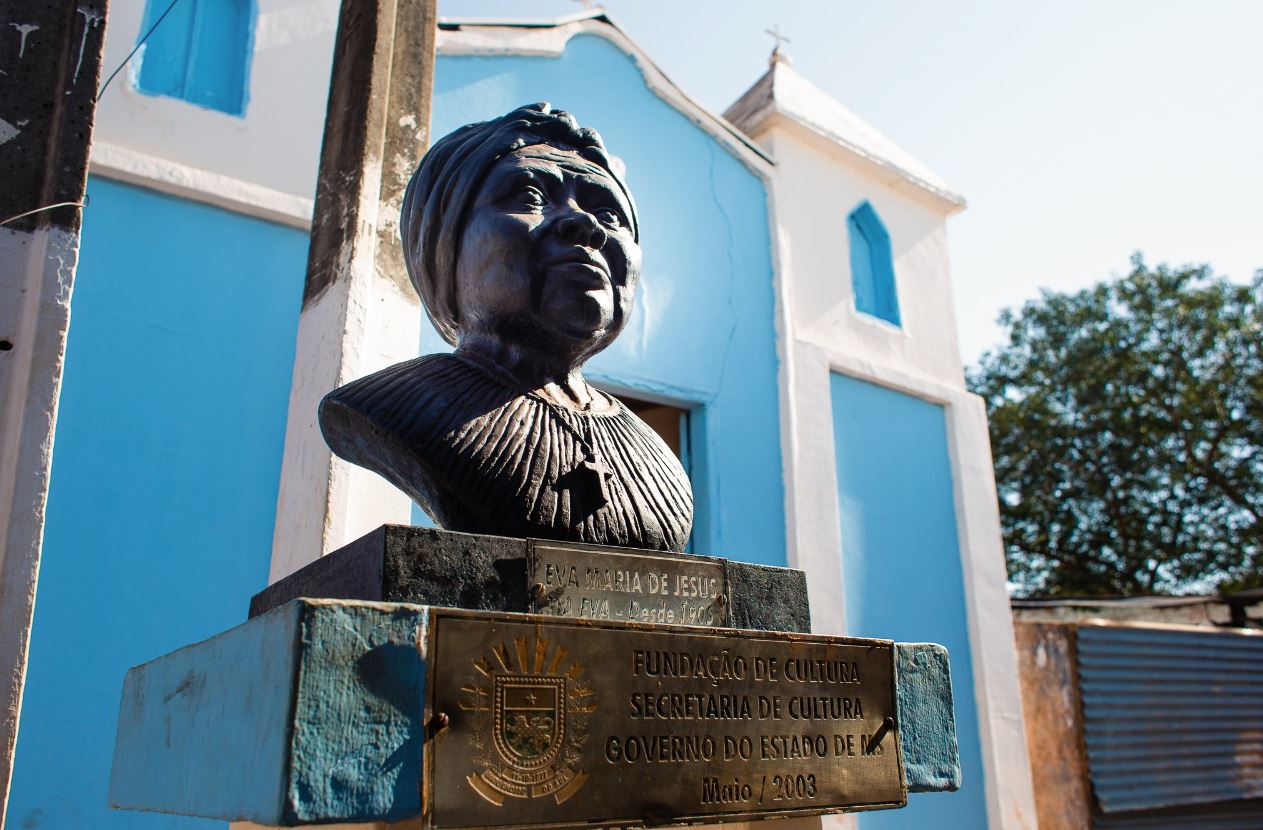 Busto de Eva Maria de Jesus, a Tia Eva, em frente à Igreja de São Benedito, na Comunidade Quilombola Tia Eva, em Campo Grande, símbolo da resistência e da ancestralidade negra no estado.