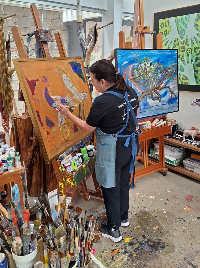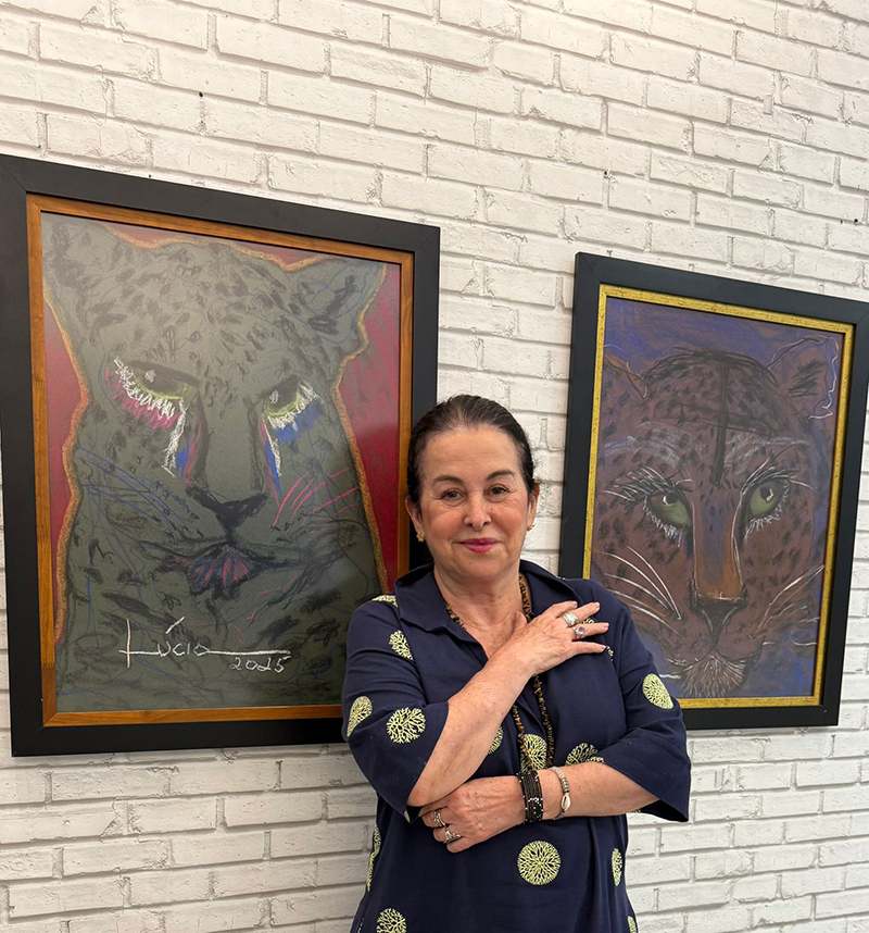 Lúcia trabalha com pastel sobre papel e acrílico sobre tela, combinando técnica e sensibilidade para expressar o que observa no cotidiano e no ecossistema do Pantanal
