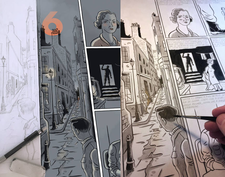 A perseguição a mentes esclarecidas, fio condutor do romance, se fez presente no cenário apocalíptico e desolador da pandemia, pondera o cartunista. "Durante o processo todo, o livro estava mais vivo do que nunca, uma distopia foi mergulhando em outras." Cinzas e matizes de sépia se misturam dando ao cenário um clima de poeira, névoa típica da vigilância constante, um estado de espírito bélico e autoritário que embala um império fictício na Oceania que, no romance, busca dominar o mundo e aprisionar os que contestam as bravatas.