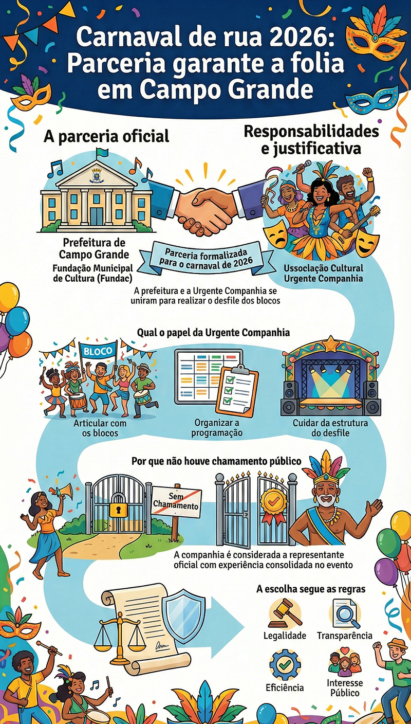 Fundação de Cultura firma parceria de R$ 90 mil com a Urgente Companhia para organizar o desfile dos blocos de rua no carnaval 2026 - (Foto: Arte A Crítica)Em uma justificativa publicada pela Fundação de Cultura, a Prefeitura explica que não foi feito chamamento público porque a Urgente Companhia é considerada “representante oficial responsável pelo desfile dos blocos de rua do carnaval da cidade, com experiência consolidada na realização do Carnaval de Campo Grande”.