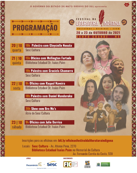 A partir de hoje (20) inicia em Campo Grande o "I Festival da Literatura Indígena". O evento acontece nos dias 20, 21, 22 e 23 de outubro e conta com a parceria do Sesc Cultura e da Biblioteca Pública Estadual Isaías Paim. O premiado escritor Daniel Munduruku, o primeiro grupo de rap indígena do Brasil, Brô MC's, Graciela Chamorro e a poeta Gleycielli Nonato integram a programação.