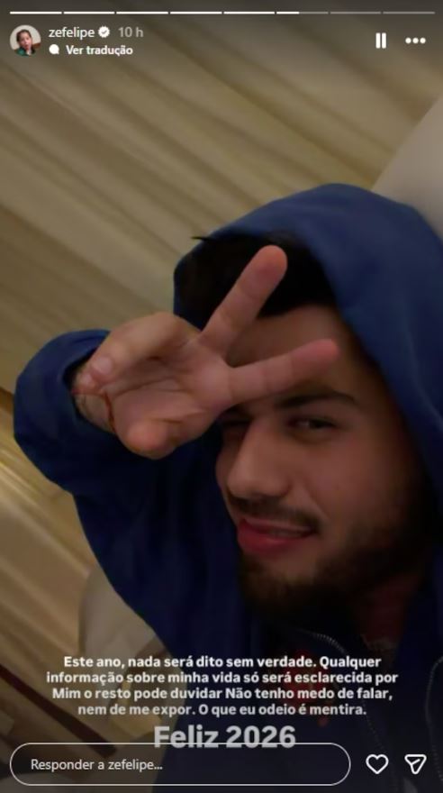 “Este ano, nada será dito sem verdade. Qualquer informação sobre a minha vida só será esclarecida por mim. O resto pode duvidar. Não tenho medo de falar nem de me expor. O que eu odeio é mentira. Feliz 2026!”, escreveu Zé Felipe na postagem.