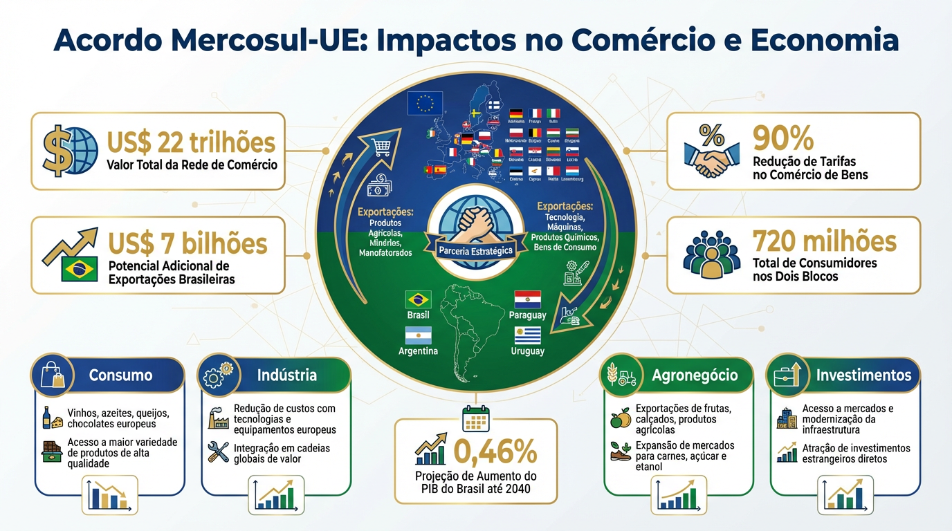 O acordo envolve os 27 países da União Europeia e os quatro integrantes do Mercosul — Brasil, Argentina, Paraguai e Uruguai — e abrange um mercado de cerca de 720 milhões de consumidores, o equivalente a aproximadamente 25% do PIB global. Estimativas do Instituto de Pesquisa Econômica Aplicada (Ipea) indicam que o Brasil deve ser o principal beneficiado, com projeção de aumento de 0,46% no PIB até 2040.