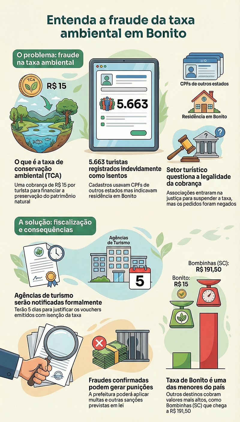 A Prefeitura de Bonito, a 260 km de Campo Grande, está investigando possíveis fraudes na cobrança da Taxa de Conservação Ambiental (TCA). A fiscalização identificou indícios de irregularidades em vouchers de passeios e em cadastros de turistas que teriam sido registrados como moradores da cidade para ficarem isentos do pagamento.