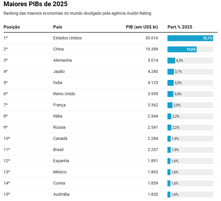 O Brasil deixou de figurar entre as dez maiores economias do mundo em 2025, caindo para a 11ª posição no ranking global do Produto Interno Bruto (PIB), segundo relatório da agência Austin Rating com base em dados do Fundo Monetário Internacional (FMI). A Rússia, impulsionada por forte valorização do rublo, ultrapassou o Brasil e também o Canadá, subindo da 11ª para a 9ª colocação.