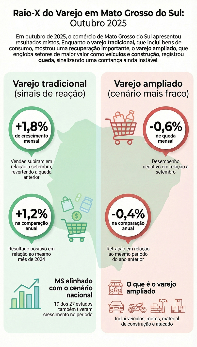 O comércio varejista de Mato Grosso do Sul mostrou reação em outubro de 2025, segundo a Pesquisa Mensal de Comércio divulgada nesta quintafeira (11) pelo IBGE. As vendas no varejo, que incluem lojas de roupas, alimentos e outros bens de consumo, subiram em relação a setembro e também em comparação com outubro de 2024.