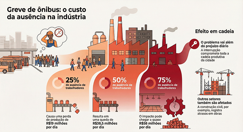 O levantamento usa dados da Pesquisa Industrial Anual do IBGE para estimar o impacto. A Fiems calcula que cada trabalhador da indústria de transformação gera, em média, cerca de R$3.500 por dia útil. Quando esses profissionais deixam de chegar ao trabalho por falta de transporte, a produção cai no mesmo ritmo.