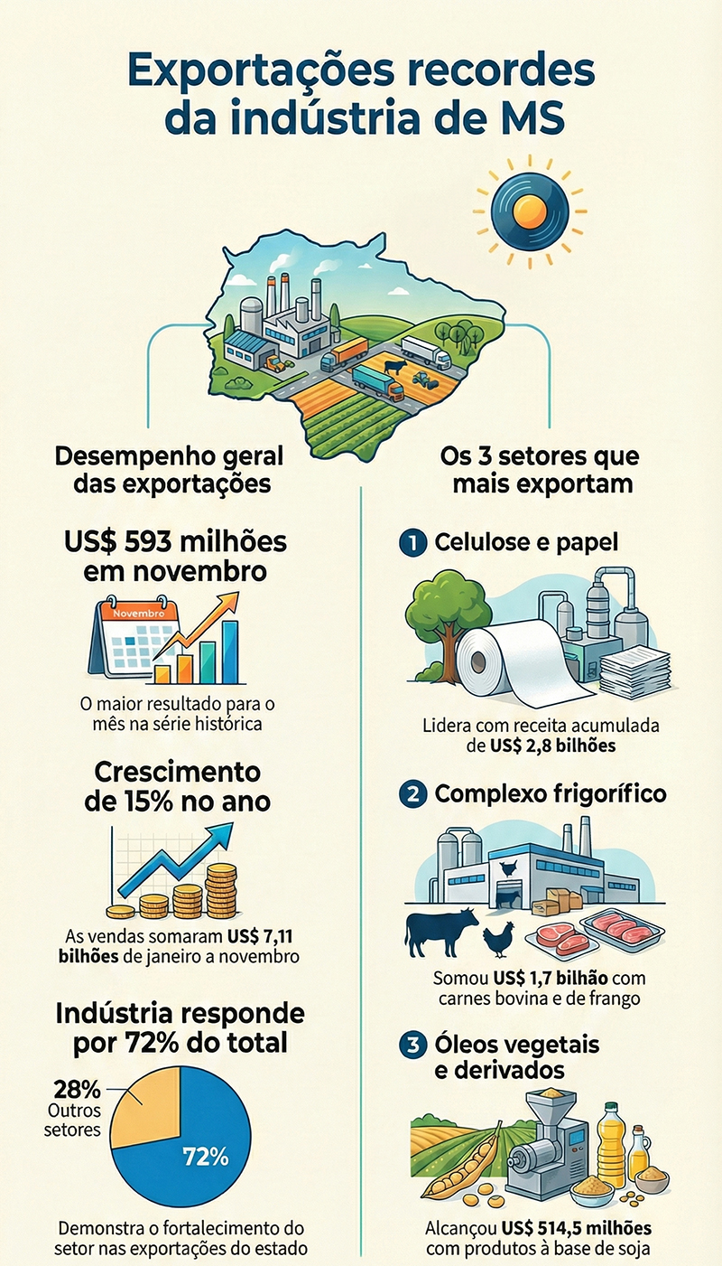 A indústria de Mato Grosso do Sul teve em novembro o maior resultado já registrado de exportações para o mês na série histórica, com receita de cerca de US$ 593 milhões. Isso representa um avanço de 3% em relação a novembro de 2024, segundo dados do Observatório da Indústria da Fiems divulgados hoje (16).