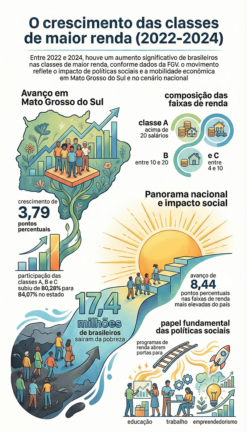 Aumento da renda do trabalho e de políticas como Bolsa Família e BPC elevou a participação de sul-mato-grossenses nas classes A, B e C, segundo a FGV. - (Foto: Arte A Crítica)Segundo o ministro do Desenvolvimento e Assistência Social, Família e Combate à Fome, Wellington Dias, os números refletem o impacto das políticas voltadas à população de baixa renda. Para ele, os programas sociais têm contribuído para a mobilidade social, permitindo que parte do público do Cadastro Único e do Bolsa Família alcance a chamada classe média, ao combinar transferência de renda com acesso à educação, trabalho e empreendedorismo.