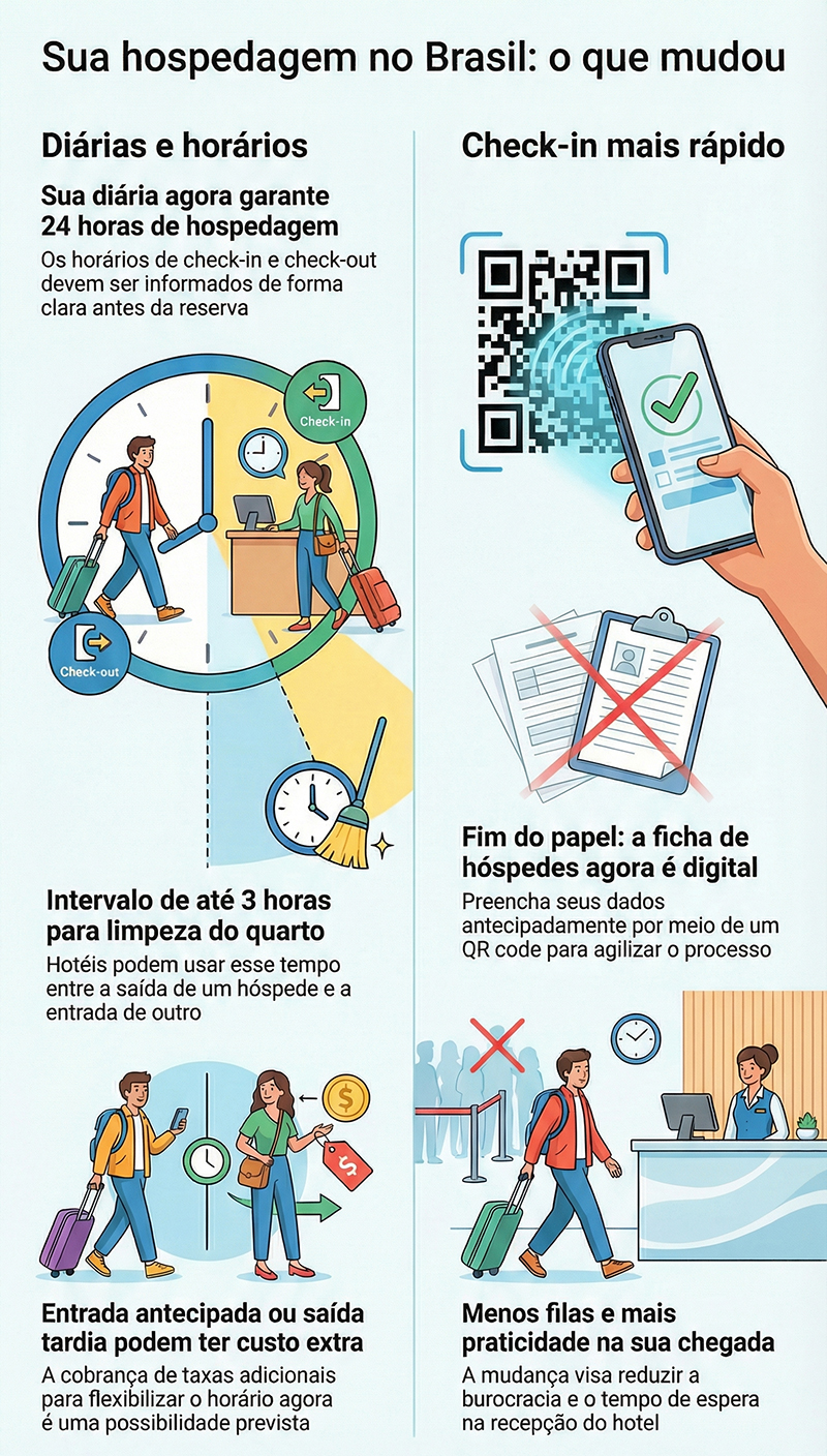 Os horários de check-in e check-out continuam sendo definidos por cada hotel, mas devem ser informados de forma clara antes da compra da diária, seja diretamente com o hotel, por agências de viagem ou em plataformas de reserva online.