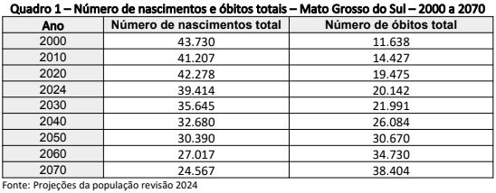 A partir de 2050, o número de óbitos no estado superará o de nascimentos, com 30.670 óbitos e 30.390 nascimentos projetados para esse ano. Em 2070, essa diferença se acentuará, com 38.404 óbitos e apenas 24.567 nascimentos.