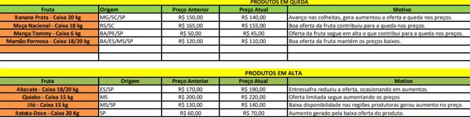 Quem passou pela Ceasa/MS nos últimos dias encontrou preços menores em frutas bastante procuradas. A banana-prata, uma das favoritas dos consumidores, ficou até 6,6% mais barata. A maçã nacional também teve redução semelhante. Além delas, o mamão e a manga Tommy continuam em queda, o que ajuda a equilibrar o carrinho de quem compra no atacado.
