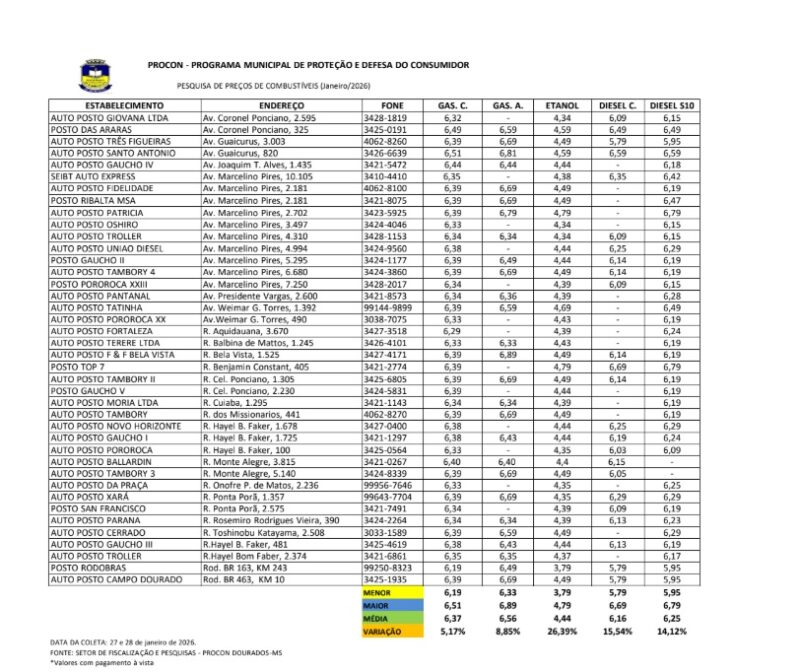 Os menores valores encontrados foram de R$ 6,19 para a gasolina comum, R$ 3,79 para o etanol, R$ 5,79 para o diesel comum e R$ 5,95 para o diesel S10. A pesquisa também avaliou gasolina aditivada, além de comparar os preços atuais com os praticados em dezembro de 2025.