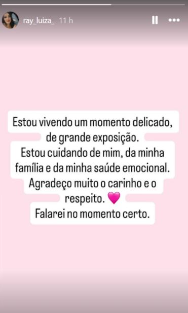 Na noite desta quinta-feira, 15, Rayne usou os stories para comentar o momento que enfrenta desde que a intimidade do casal foi exposta no programa. No texto, ela afirmou estar priorizando a própria saúde emocional e o bem-estar da família.