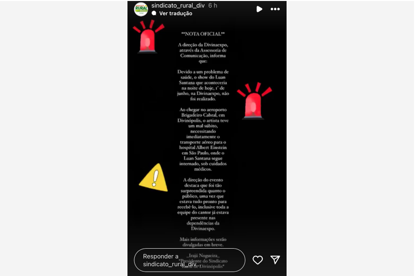 No comunicado, assinado por Irajá Nogueira, presidente do Sindicato Rural de Divinópolis, a instituição informou que Luan teria chegado ao Aeroporto Brigadeiro Cabral, em Divinópolis, quando passou mal. Ainda conforme a nota, o cantor teria necessitado de transporte imediato para o hospital na capital paulista.