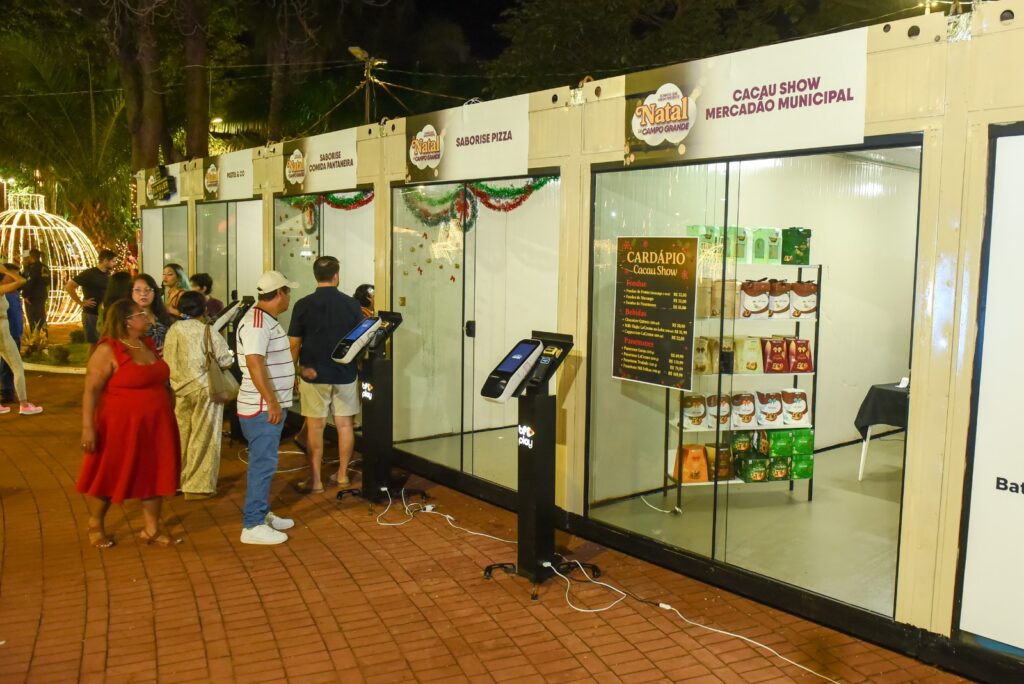 Além da decoração, a Praça Ary Coelho recebeu uma área gastronômica que rapidamente virou ponto de encontro do público. Barracas oferecem opções como choripán, cachorro-quente, sorvetes e bebidas, com pagamento em totens eletrônicos que facilitaram o fluxo e reduziram filas.