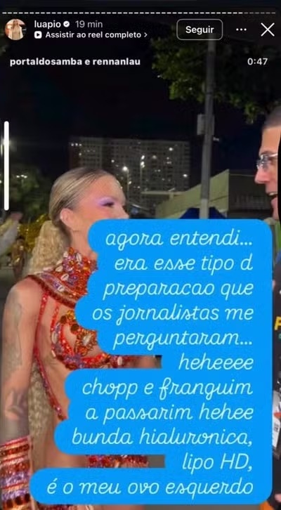 Luana Piovani criticou procedimentos estéticos realizados pela musa da Estácio de Sá. (Foto: Reprodução/Instagram)Após a repercussão, a musa se manifestou nas redes sociais e classificou a atitude como desrespeitosa. Em resposta direta, questionou o discurso de Piovani em defesa das mulheres e apontou incoerência na postura da atriz.