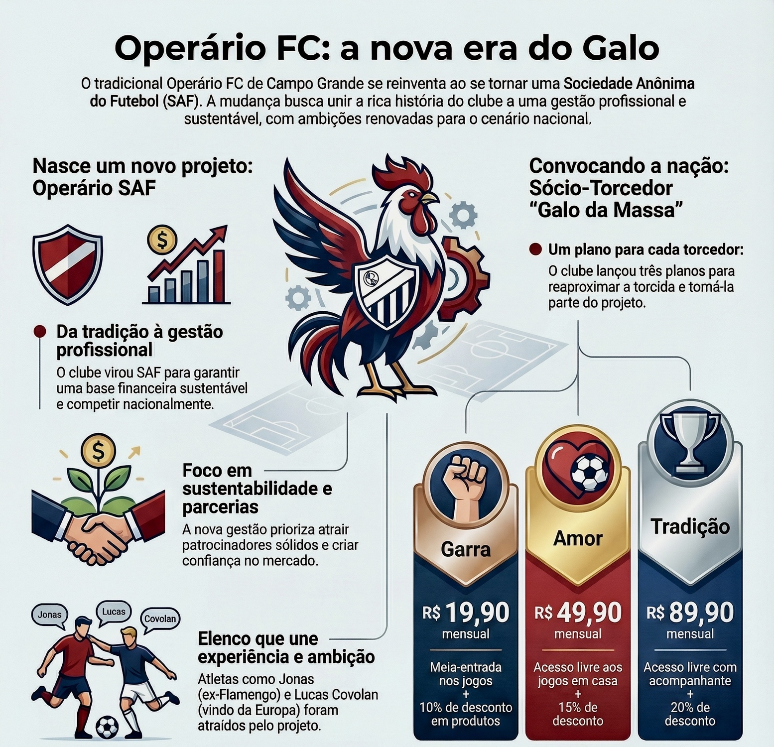 O Operário Futebol Clube, fundado em 21 de agosto de 1938 por trabalhadores da construção civil em Campo Grande, viveu décadas de glórias, dificuldades e reviravoltas. Foi protagonista no cenário regional com 14 títulos sulmatogrossenses, ídolo de uma torcida que viu o Galo conquistar vitórias e, por vezes, enfrentar severos tropeços. Em 2025, essa história ganhou um novo capítulo com a transformação em Sociedade Anônima de Futebol (SAF), aprovada por unanimidade pelo Conselho Deliberativo. Era o momento de combinar tradição com gestão profissional.