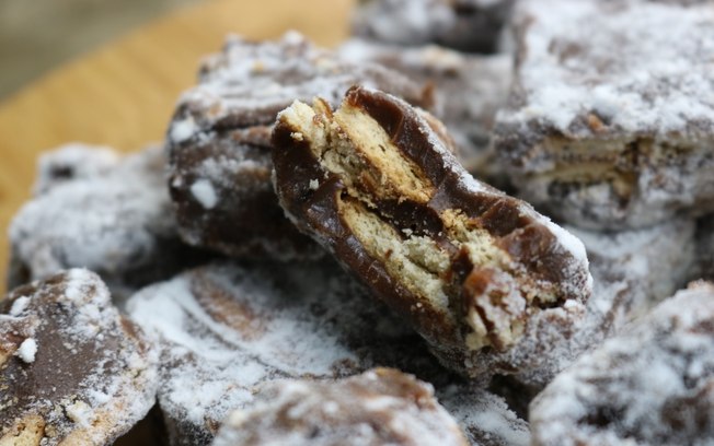 1. Pique o biscoito em pedacinhos pequenos e reserve.
