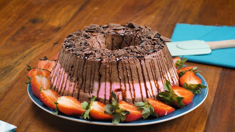 3. Numa forma com furo central, faça uma camada com o sorvete de chocolate.