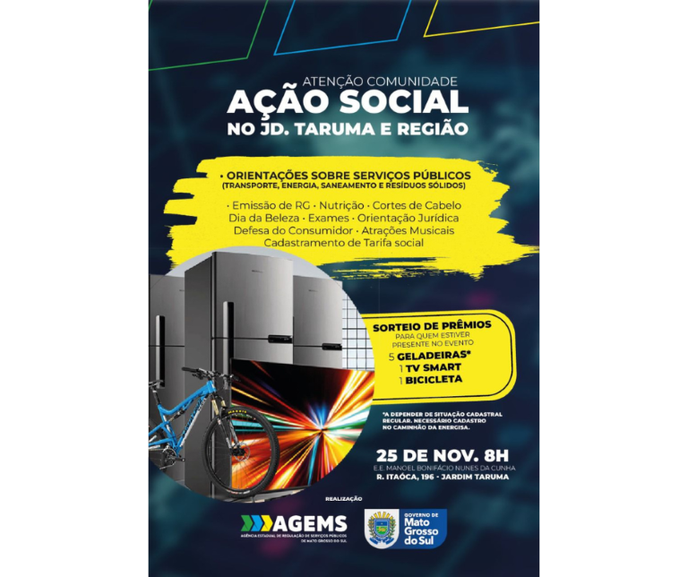Neste sábado (25) a Agência Estadual de Regulação (Agems) realizará uma grande ação social, em parceria com mais de 30 entidades, para oferecer diversos serviços e prêmios à população de Campo Grande. O evento "Agems Perto de Você" acontecerá na Escola Estadual Manoel Bonifácio Nunes da Cunha, no bairro Jardim Tarumã, das 8h às 12h.
