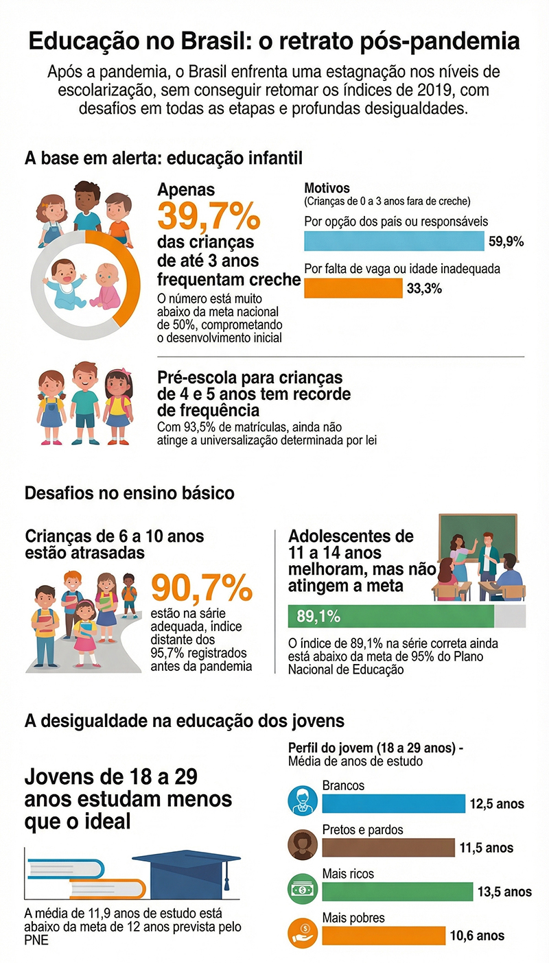 Matrícula em creches e pré-escolas continua abaixo do esperado - Outro desafio revelado pela pesquisa está na educação infantil. Apenas 39,7% das crianças de até três anos estavam matriculadas em creches neste ano, abaixo da meta de 50% prevista no PNE. A frequência melhora entre as crianças de 4 e 5 anos, com 93,5% frequentando a pré-escola — um recorde histórico, mas ainda insuficiente para alcançar a universalização determinada por lei.