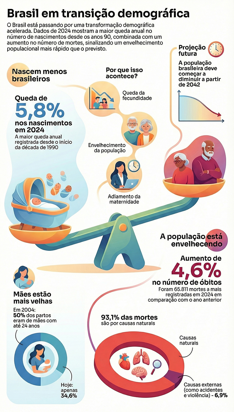 A tendência de queda na natalidade completa agora seis anos seguidos, e o recuo de 2024 foi mais intenso do que o registrado em momentos críticos, como a pandemia de Covid-19, em 2020, e o surto de Zika, em 2016.