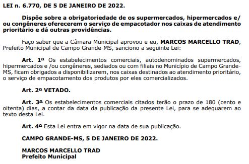 "Os estabelecimentos comerciais, autodenominados supermercados, hipermercados e /ou congêneres, sediados ou com filiais no município de Campo Grande ficam obrigados a disponibilizarem, nos caixas destinados ao atendimento prioritário, o serviço de empacotamento dos produtos por eles comercializados", diz o decreto publicado. Os estabelecimentos comerciais terão o prazo de 180 dias, a contar da data da publicação da presente Lei, para se adequarem ao texto desta Lei. Art. 4º.