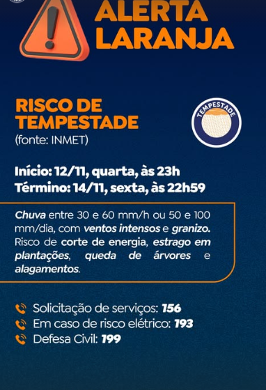 A Defesa Civil Municipal de Campo Grande informou que o Instituto Nacional de Meteorologia (INMET) emitiu Alerta Laranja para risco de tempestades na Capital. O aviso teve início às 23h desta quarta-feira (12) e segue até sexta-feira (14), às 22h59.