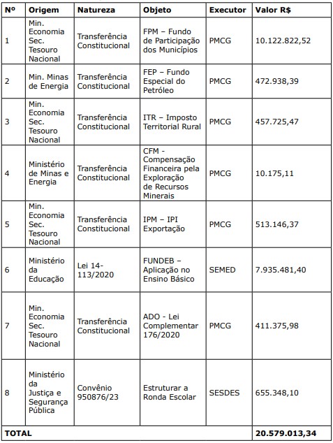 A Prefeitura de Campo Grande divulgou nesta quarta-feira (7) a chegada de R$ 20,5 milhões em repasses federais, de diferentes ministérios, para aplicação em setores essenciais do município. As informações foram publicadas no Diário Oficial de Campo Grande (Diogrande).