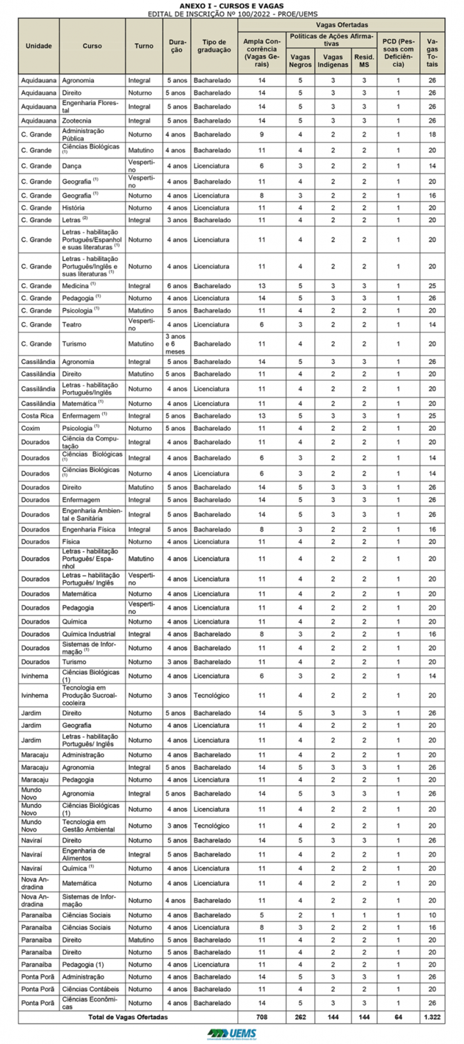 Vestibular UEMS 2023 ofertará 1.322 vagas em 64 cursos de graduação