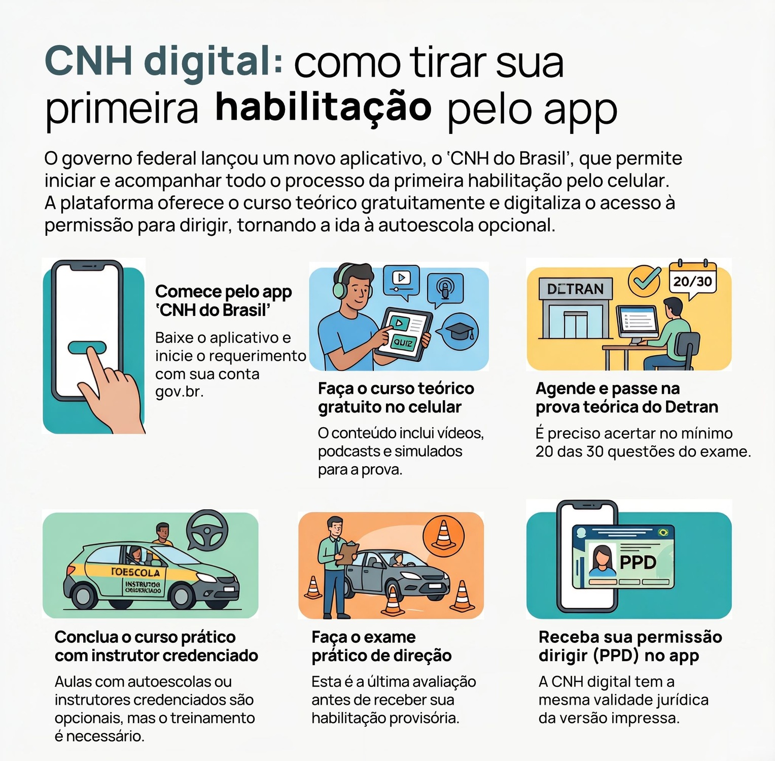 Novo app do governo permite tirar CNH direto no celular, sem autoescola, com curso teórico gratuito e processo 100% digital.Depois de terminar o curso, o candidato agenda a prova teórica com o Detran. São 30 questões de múltipla escolha. É preciso acertar pelo menos 20. O resultado aparece no app assim que for liberado pelo órgão.