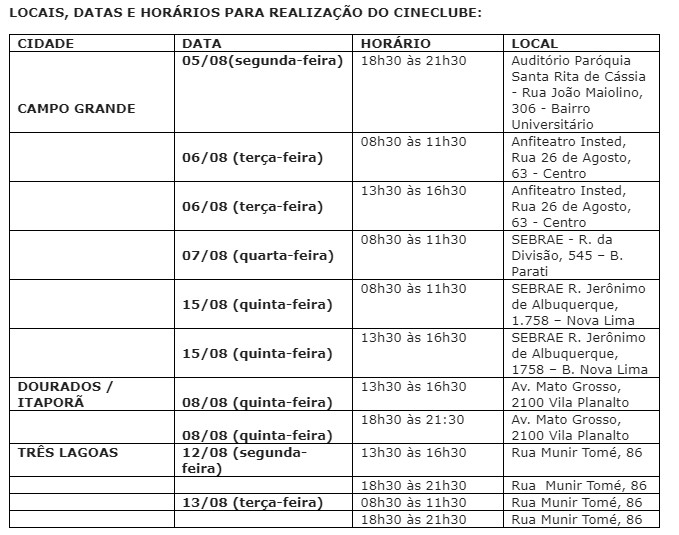 O cronograma de atividades, a iniciar no dia 5 de agosto, inclui Cineclubes presenciais e turmas de capacitação no WhatsApp, além de momentos de networking entre as participantes. Com conteúdos presenciais e online, a capacitação inclui planejamento estratégico, vendas, marketing digital, redes de contatos, gestão financeira e boas práticas em gestão de negócios.