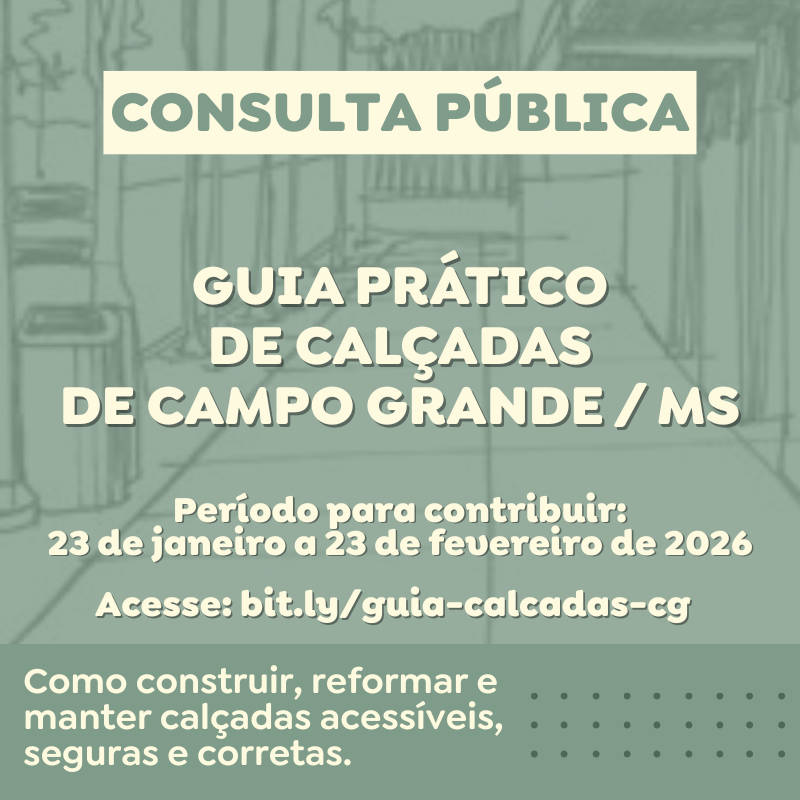 A Prefeitura de Campo Grande abriu consulta pública para que a população contribua com a minuta do Guia Prático de Calçadas de Campo Grande/MS. O documento está disponível no site da Planurb (Agência Municipal de Meio Ambiente e Planejamento Urbano) e recebe sugestões até 23 de fevereiro de 2026.