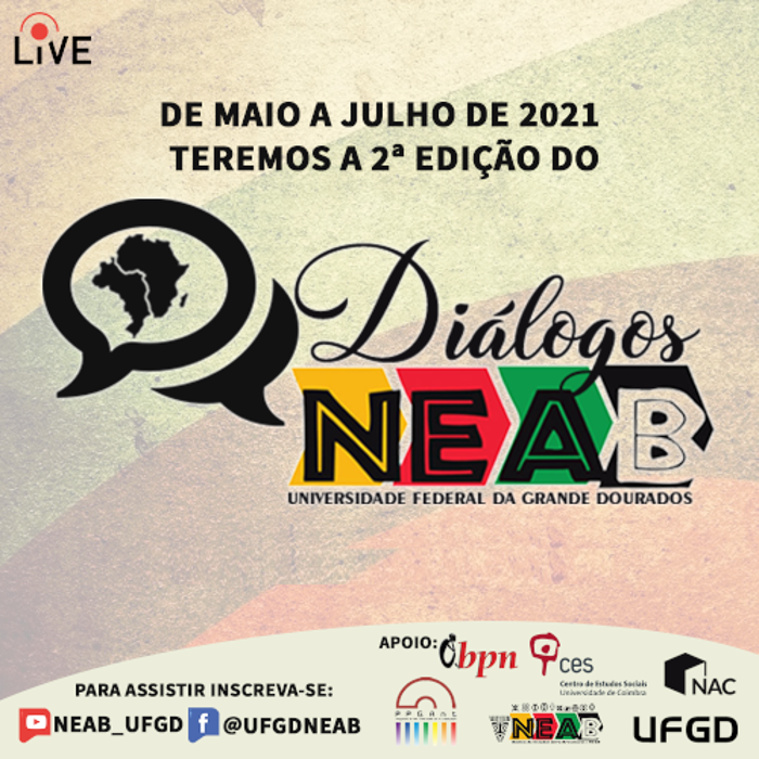 De maio a julho de 2021, acontece a segunda edição do evento Diálogos NEAB/UFGD, atividade de extensão realizada pelo Núcleo de Estudos Afro-Brasileiros da Universidade Federal da Grande Dourados (NEAB/UFGD) e que tem como premissa colocar em debate temas centrais da contemporaneidade no campo das relações étnico-raciais.