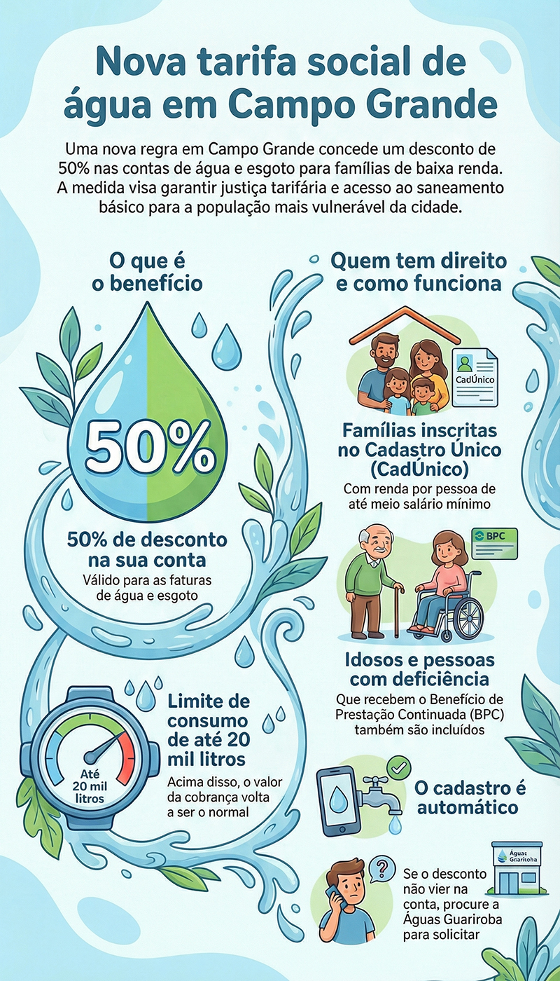 O cadastro para a tarifa social será feito automaticamente para quem já está no CadÚnico e atende aos critérios. Caso o benefício não apareça na conta, o morador poderá procurar diretamente a Águas Guariroba, concessionária responsável pelo serviço na Capital, para solicitar a inclusão na tarifa social e regularizar a situação.