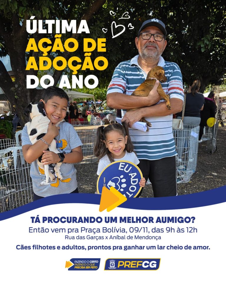 A Superintendência de Bem-Estar Animal (Subea) de Campo Grande realiza neste domingo (9), das 9h às 12h, na Praça Bolívia, a última feira de adoção de animais de 2025. Estarão disponíveis para adoção cães e gatos, adultos e filhotes, que foram resgatados de situações de abandono ou maus-tratos.