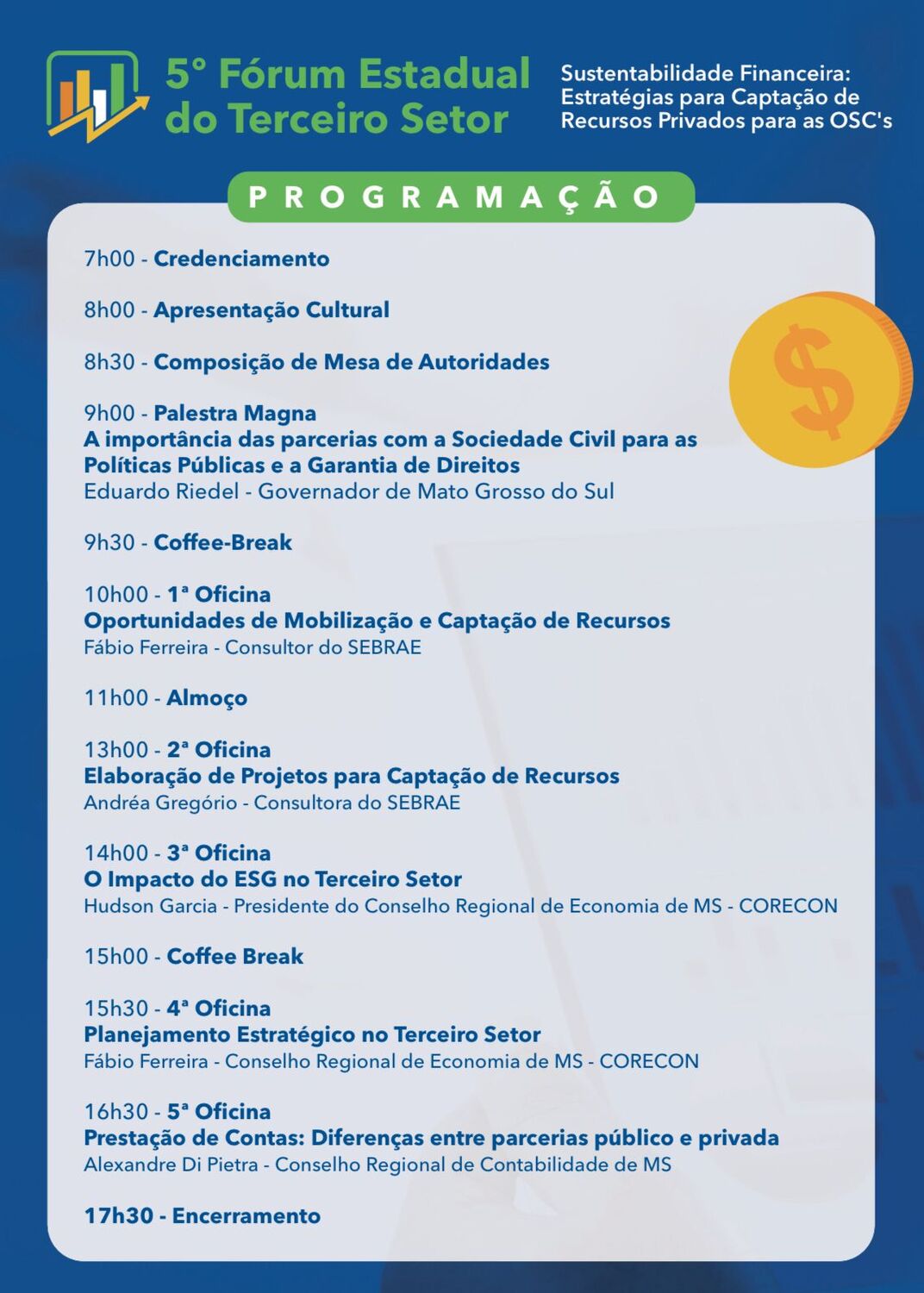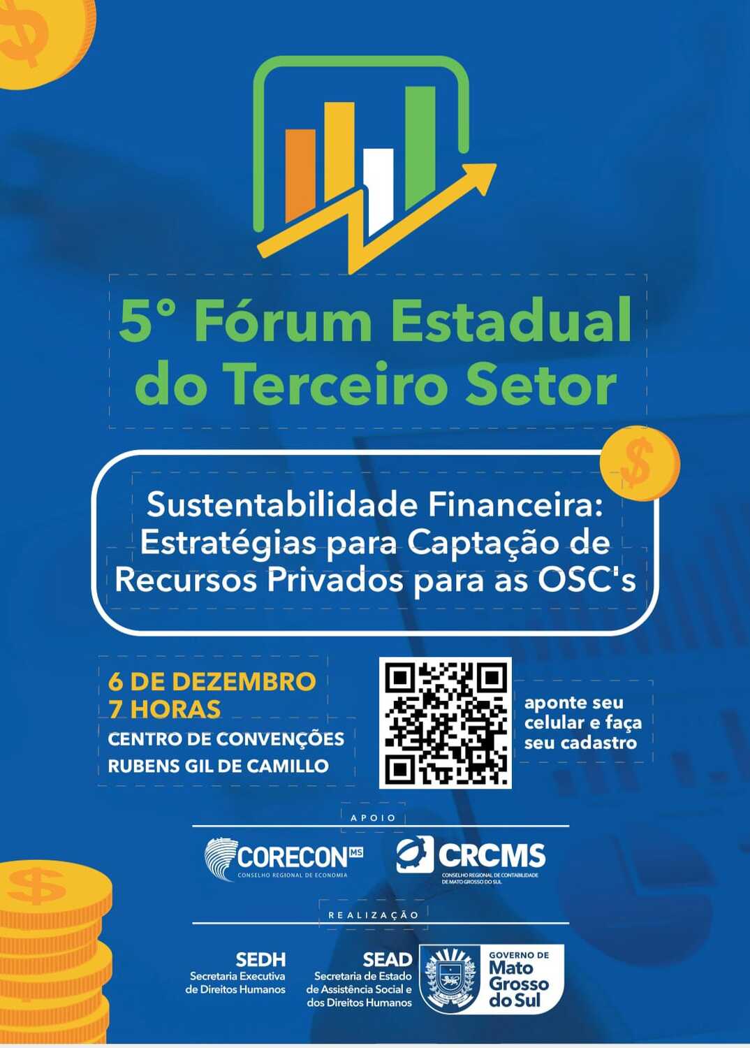 Este ano, o foco do Fórum é a captação de recursos privados, visando fortalecer a autonomia financeira das Organizações da Sociedade Civil (OSC´s) em Mato Grosso do Sul. O evento incluirá palestras e debates, com participação de parceiros como o Sebrae/MS, o CRC e o Corecon, e tem como objetivo principal compreender o cenário atual da saúde financeira das OSC´s, fomentar discussões sobre a sustentabilidade do Terceiro Setor e ampliar o acesso das OSC’s a recursos.