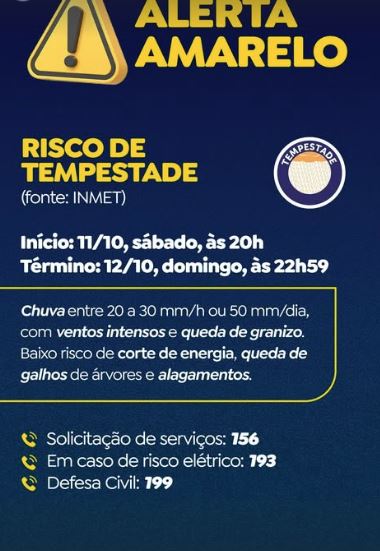 O INMET prevê precipitações com intensidade de 20 a 30 mm por hora, ou até 50 mm no total do dia, acompanhadas por ventos fortes e possibilidade de granizo. A previsão indica risco moderado de queda de energia, alagamentos, queda de galhos e descargas elétricas.