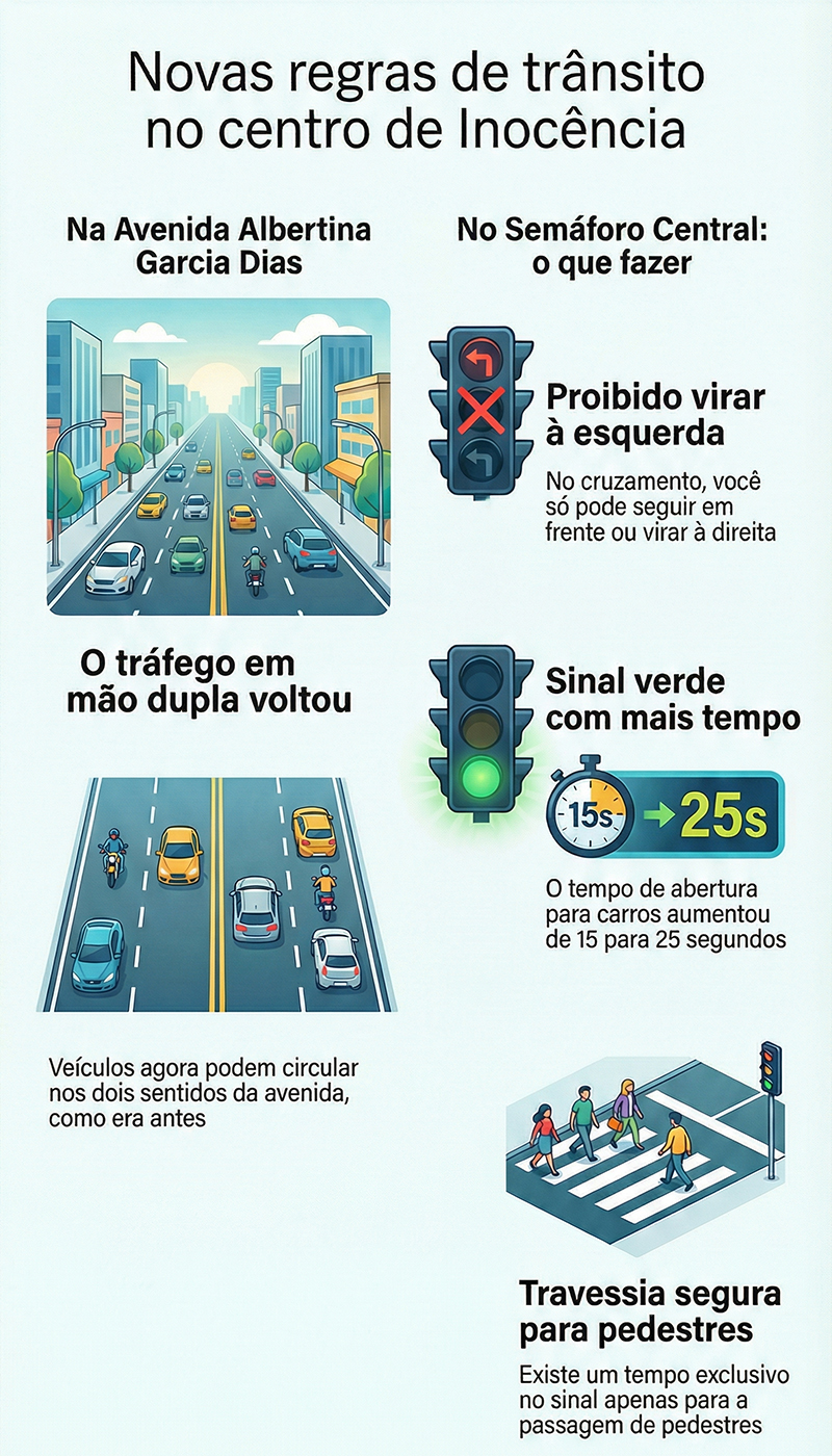 Inocência, a 330 km de Campo Grande, reestabeleceu o tráfego bidirecional na Avenida Albertina Garcia Dias, devolvendo plena mobilidade aos condutores. Agora, veículos podem trafegar tanto no sentido Capim → Avenida Dois/Posto de Saúde quanto no sentido contrário, retomando a configuração normal da via.
