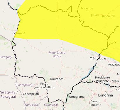 Em novo aviso, o Instituto Nacional de Meteorologia (Inmet) emitiu o alerta amarelo, iniciado às 10h de hoje (11) para várias cidades de Mato Grosso do Sul, prevendo chuvas intensas de 20 a 30 mm/h ou até 50 mm/dia, além de ventos fortes que podem alcançar de 40 a 60 km/h. O alerta é válido até as 10h de amanhã (12).