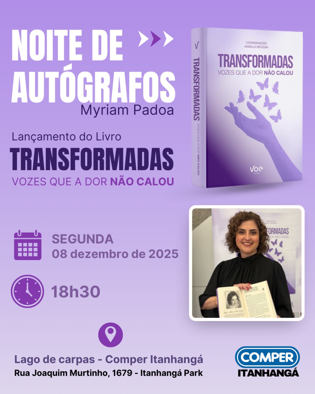 Na próxima segunda-feira (08 de dezembro), às 18h30, Campo Grande será palco de uma noite para acolher histórias de dor que viraram força. A psicóloga, administradora e terapeuta sistêmica Myriam Padoa participa de uma sessão de autógrafos da obra Transformadas: Vozes que a Dor Não Calou, no Comper Itanhangá, espaço escolhido por ela por seu significado afetivo e acolhedor.