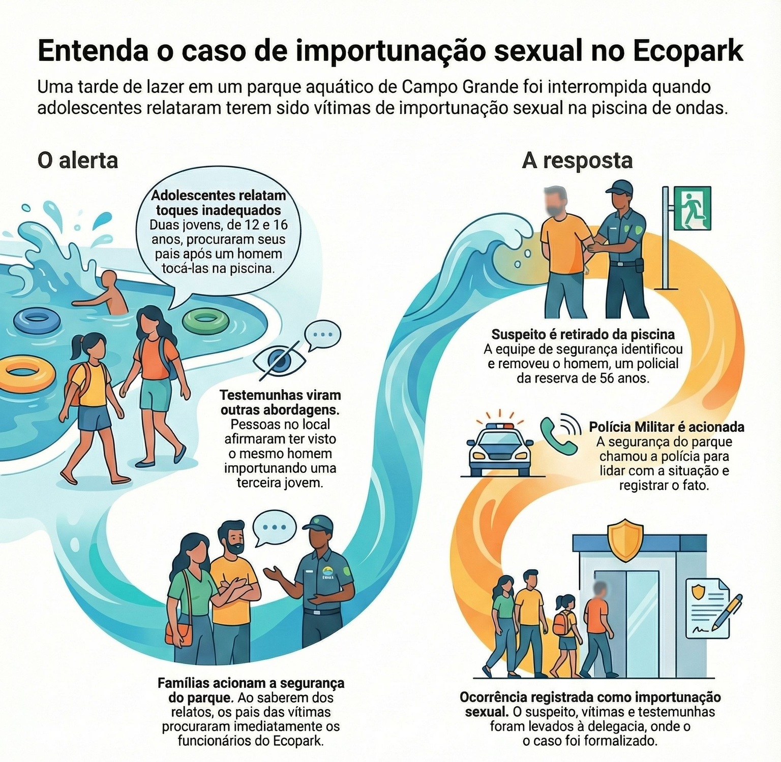 Uma tarde de lazer terminou com a presença da Polícia Militar no Ecopark, em Campo Grande. Pais acionaram a segurança do parque e a polícia após adolescentes relatarem episódios de importunação sexual na piscina de ondas.